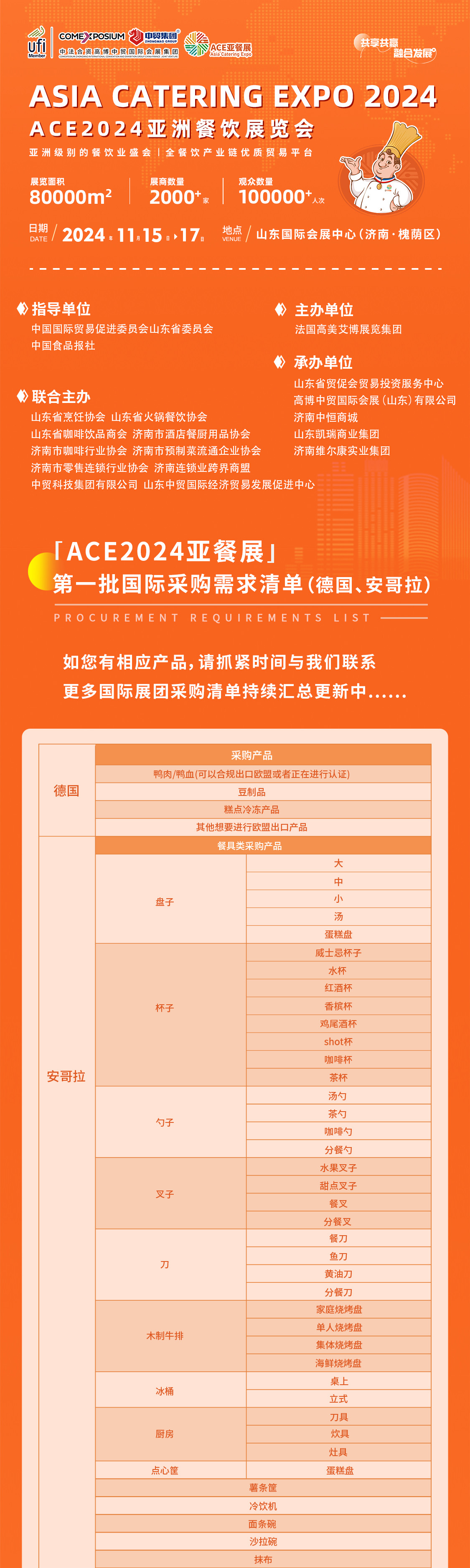 11月15日,ACE2024亞餐展即將盛大開幕,如您有品牌宣傳、展示以及市場拓展的計劃,或者有參觀選品的計劃,可在留言區(qū)留下您的需求信息,我們將第一時間聯(lián)系您。您也可致電:0531-82350000 0551-67102222咨詢參展、參觀哦。